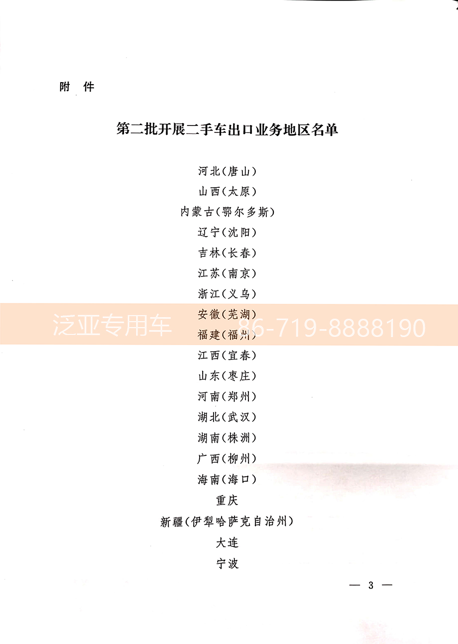 开展二手车出口是当前稳外贸工作的创新性业务之一,有利于促进国内汽车消费升级,推动汽车产业健康发展。首批二手车出口业务于2019年4月推展开来的且实现批量出口。现新增20个地区开展二手车业务,具体地区包括河北省唐山市、山西省太原市、内蒙古自治区鄂尔多斯市、辽宁省沈阳市、吉林省长春市、江苏省南京市、浙江省义乌市、安徽省芜湖市、福建省福州市、江西省宜春市、山东省枣庄市、河南省郑州市、湖北省武汉市、湖南省株洲市、广西壮族自治区柳州市、海南省海口市、重庆市、新疆维吾尔自治区伊犁哈萨克自治州、大连市、宁波市等20个市州。加上去年首批启动的北京、天津、上海等10个省市,全国开展二手车出口业务的地区达30个,覆盖25个省(自治区和直辖市)。
