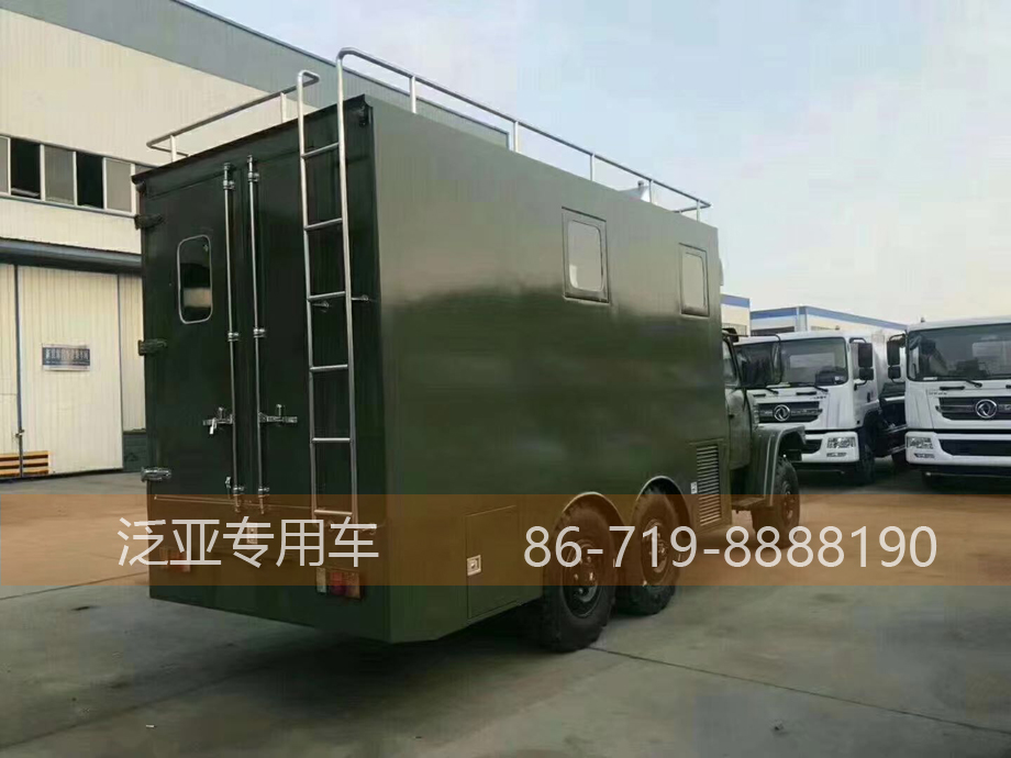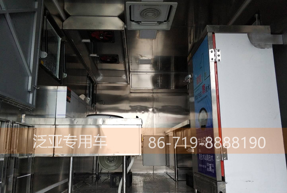 上装参数 | 上装为4.5米炊事车货箱(尾部双开门)。 包含2个柴油灶台,含锅、抽油烟机和鼓风机(满足100-200人午餐);不锈钢水箱200L一个;8kw柴油发电机一个(预留可外接电源接口);6kw蒸饭柜一个;不锈钢洗菜池两个;不锈钢案台和吊柜各一个;柴油锅炉加热器(方舱内安装2个散热口);手动翻转不锈钢餐桌一个(含折叠凳三把);方舱不设置垃圾桶和废水箱;地板为铝合金花纹板;照明灯四盏; |